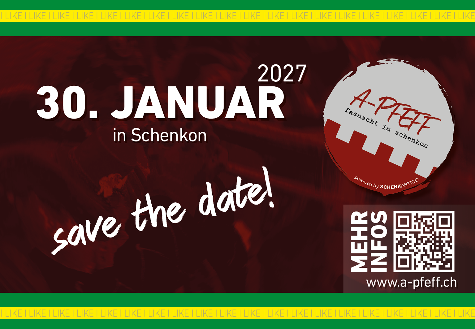 Zum fünften mal führen wir am 30. Januar 2027 den A-PFEFF in Schenkon im Kanton Luzern durch. Unser Anlass ist zusammengefasst ein Fasnachtstag mit Kinderfasnacht, Fasnachtsumzug, Monsterkonzert und einem Festbetrieb mit Livemusik und DJ’s am Abend. Weitere Informationen findet ihr unter www.apfeff.ch