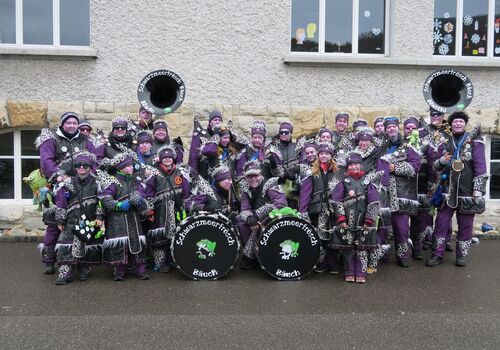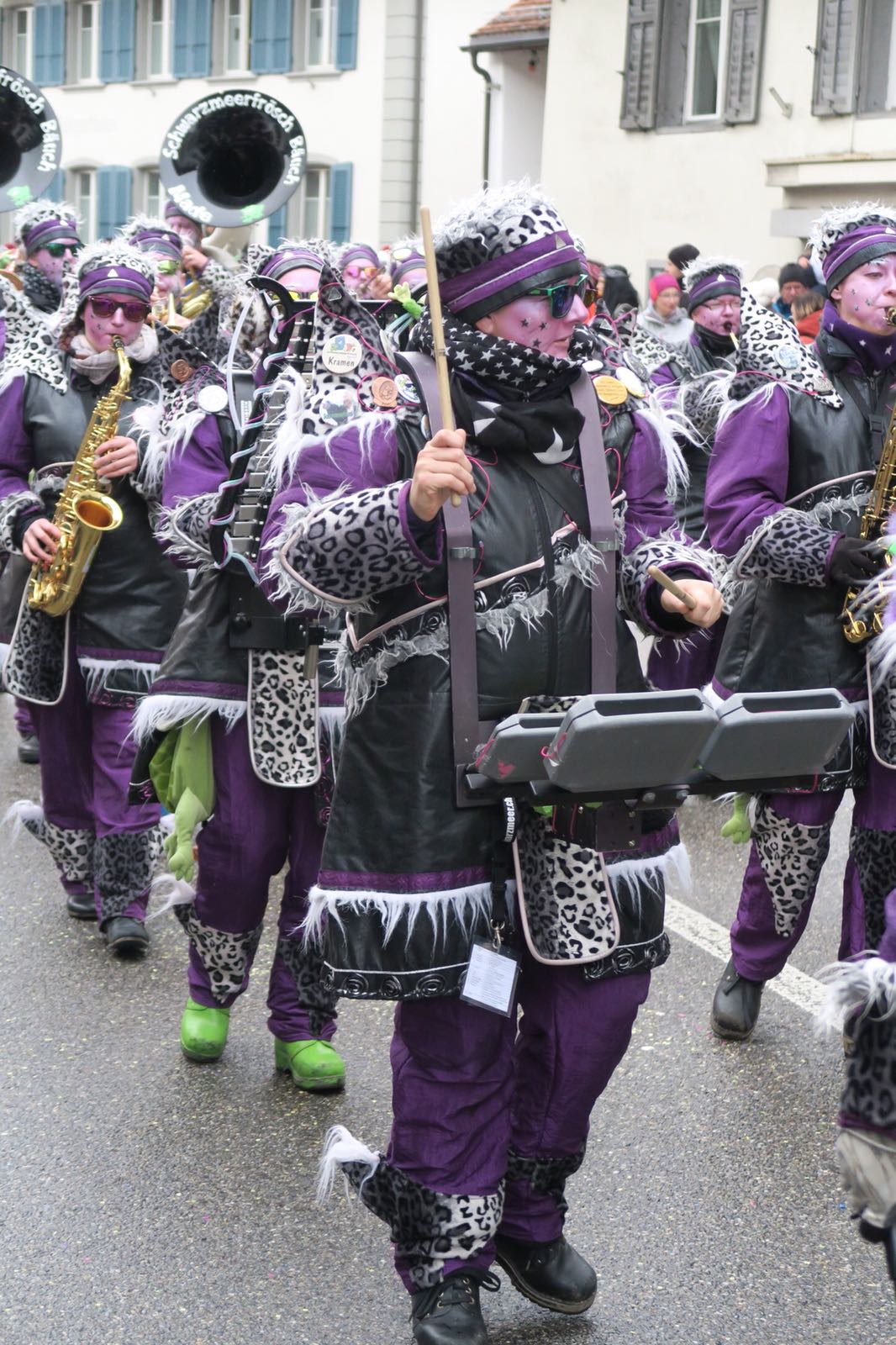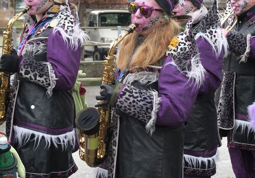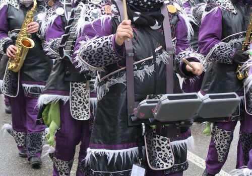 30 komplette Guggenkostüme in den Farben violett, schwarz mit Tigermuster und weissem Fell bestehend aus Jacke und Hosen und Kopfbedeckung (Hut):
