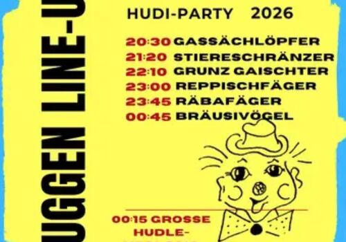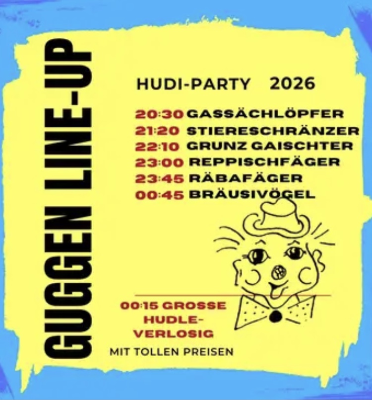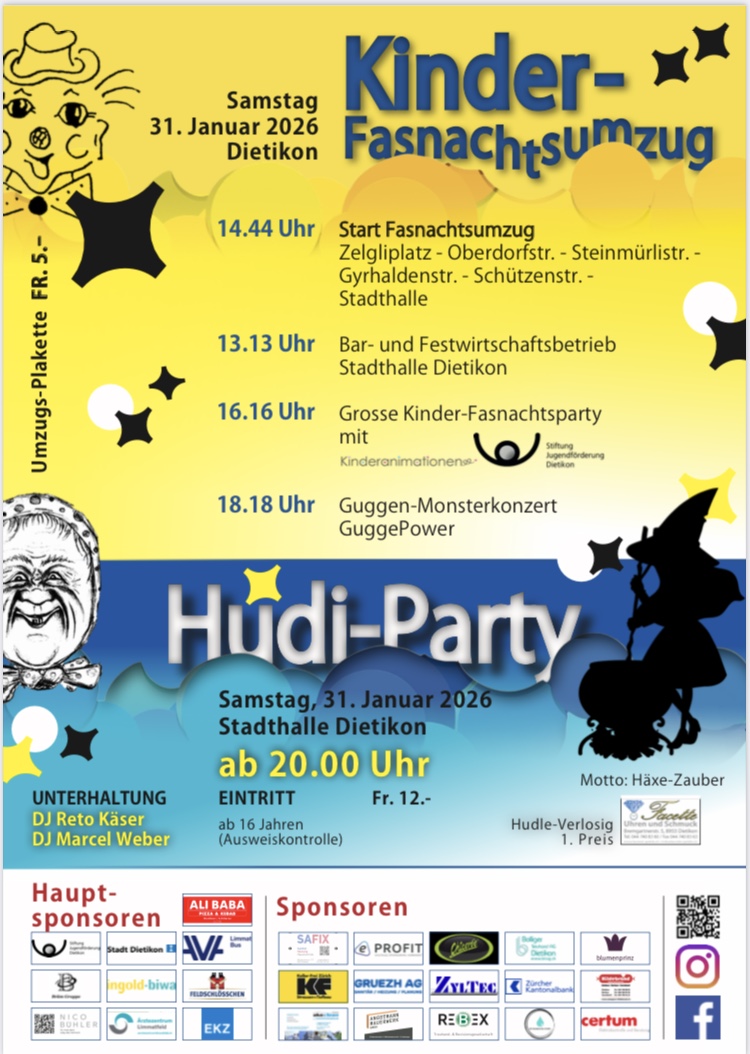 Ab 14:44 Kinderumzug mit Dietiker Schulklassen begleitet von Guggen & Wagengruppen danach grossse Kinderparty. Ab 19:45 eröffnen diee DJ‘s die Hudi-Party, Motto: Häxe-Zauber. Ab 20:30 bringen die Guggen die Stadthalle schlag auf schlag zum Beben. Um Minternacht grosse Hudleverlosung.